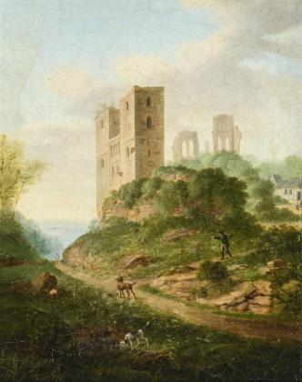 Jagdgemälde mit Burgruine.
