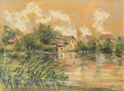 MÜHLIG, Hugo (1854 Dresden - 1929 Düsseldorf). Kleine Landschaft mit Dorf.