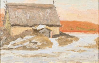 Kleine Bauernkate in Schneelandschaft bei untergehender Sonne