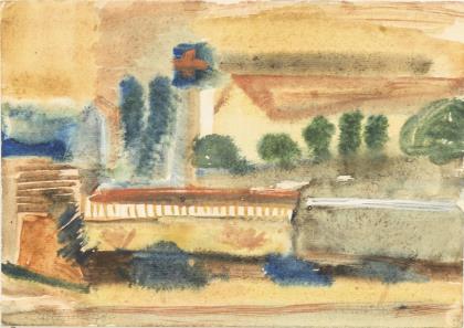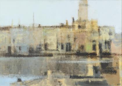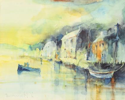 POULSEN, Georg (1911 Tranehuse/Glesborg - 1997 Odense). Abstrakte Hafenansicht.