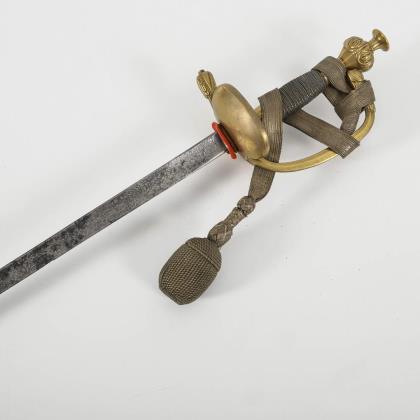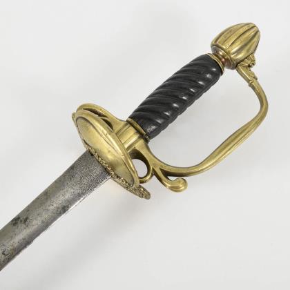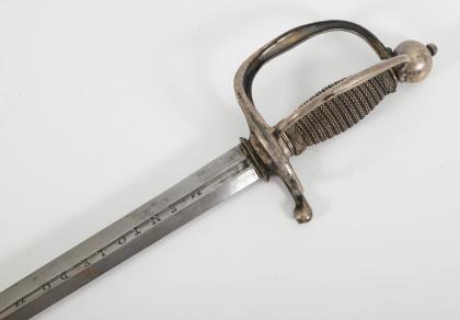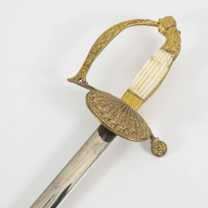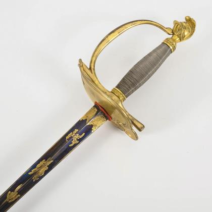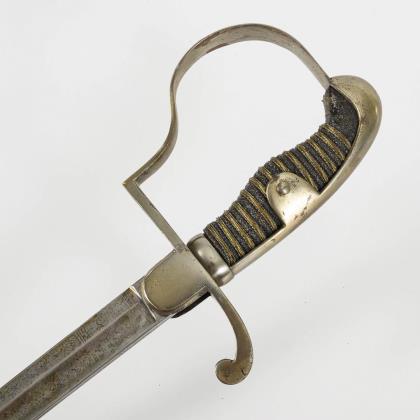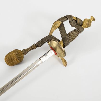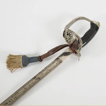 Dekorative gerade, einschneidige Klinge mit Musterätzung. Zierliches IOD Gefäß alter Art mit einem klappbaren Stichblatt. Reliefierter Bügel mit gekreuzten Blitzen. (Telegraphie-Abteilung?). Schwarze Lederscheide mit langem Haken, Mündungsstück lose. Scheide nicht ganz passend. Dazu goldfarbenes Portepee mit schwarz-weißer Musterung in der Eichelspitze