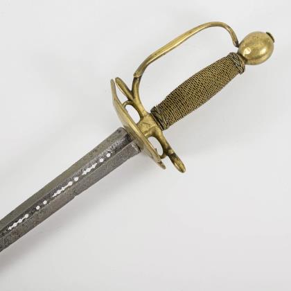 Im Querschnitt sechskantige Klinge mit Korrosionsnarben. Leicht verziertes, mehrteiliges Messinggefäß mit herzförmigem Stichblatt, angeschraubtem Bügel am großen Kugelknauf. Gerippter Griff mit feiner Drahtwicklung und vier 'Längsstreben'. Schwarze Lederscheide mit einseitig verzierter Mündungshülse und langem Haken