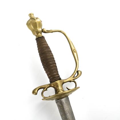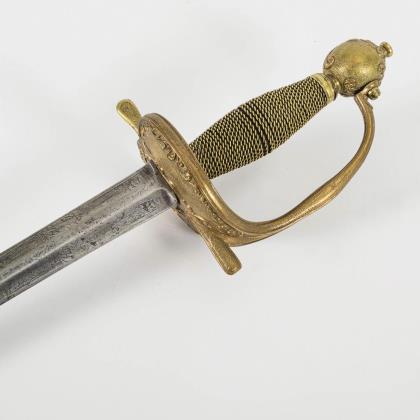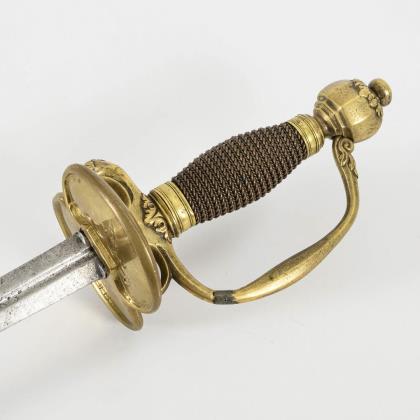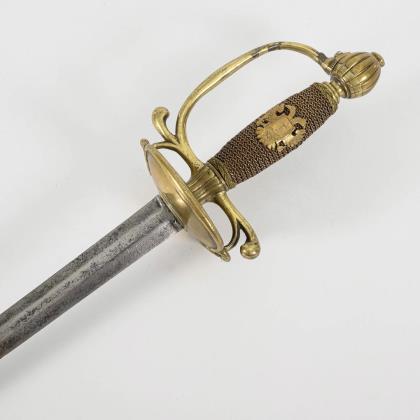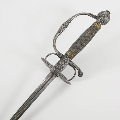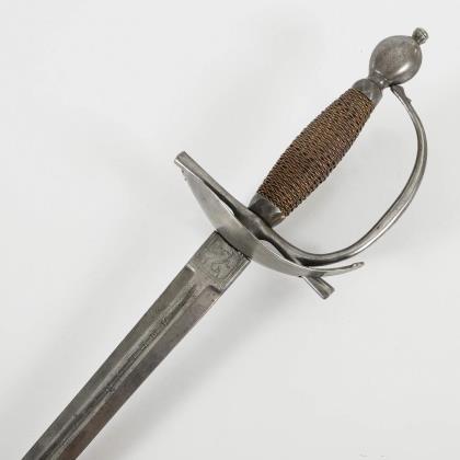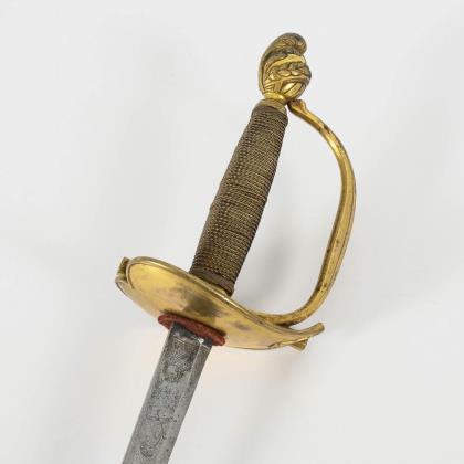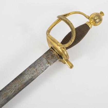 Gerade konische, zweischneidige Klinge mit seitlich versetztem Mittelgrat. Gravuren mit Resten von Vergoldung, darunter bekröntes Monogramm "GR" und Wappen des Vereinigten Königreiches. Eisengefäß mit herzförmigen Stichblatt und Kugelknauf sowie aufwändiger Drahtwicklung, dort ebenfalls Reste von Vergoldung