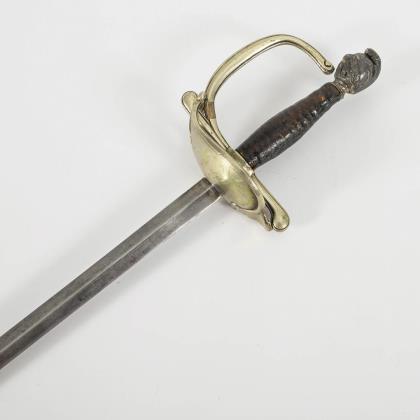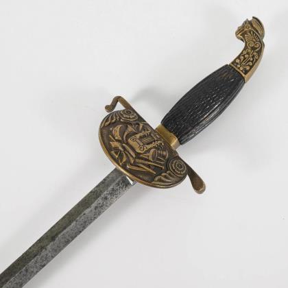 Gerade, konische Klinge mit Mittelgrat. Messingstichblatt mit reliefierten Musikinstrumenten. Schwarzer Holzgriff mit Rhombenmuster, gebogener Knauf, in einem Ritterkopf endend