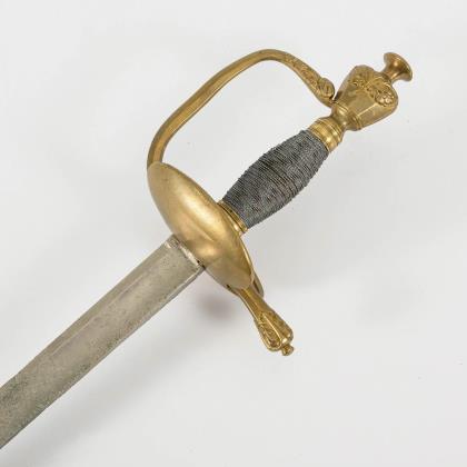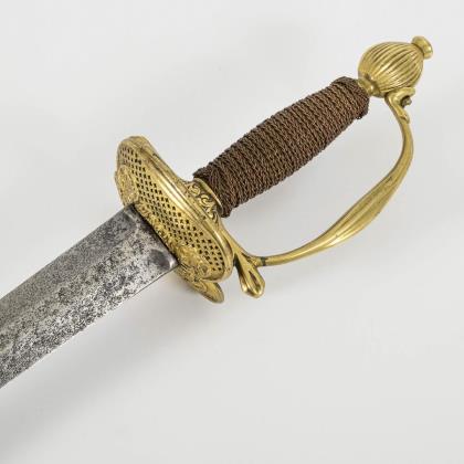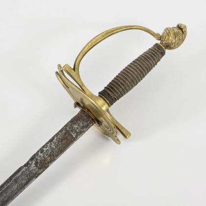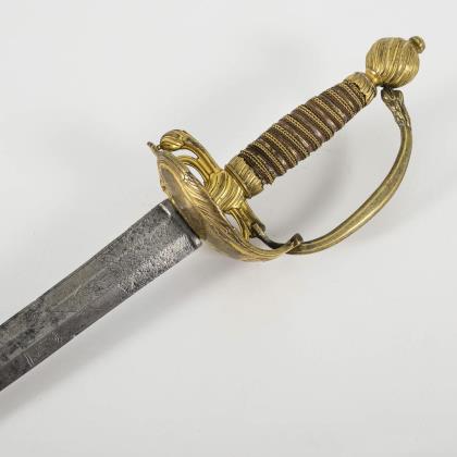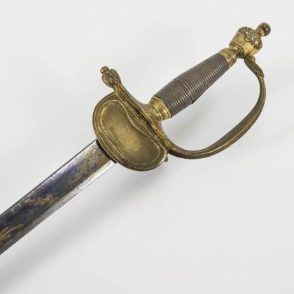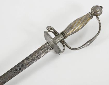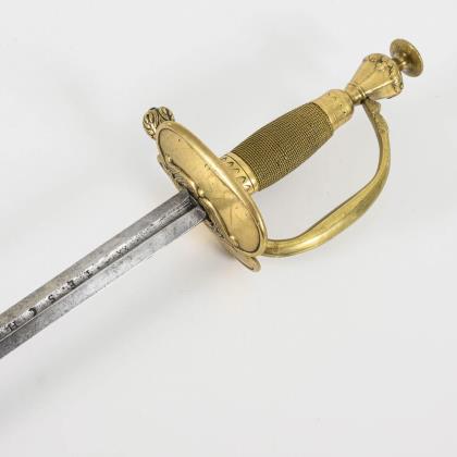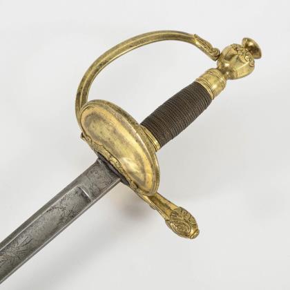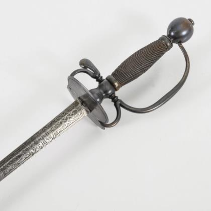 Gerade, zweischneidige Klinge mit sechskantigem Querschnitt. Bis in die Spitze verziert, sowie der Spruch: "Ne me tire pas sans raison / ne me remette point sans honneur". Glocke beidseitig und Knauf mit gravierten Trophäenstücken. Drahtwicklung. Schwarze Lederscheide mit Haken