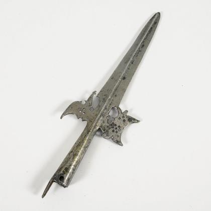 Breite, zweischneidige Klinge mit Spitze in der Mittellinie, zum Griff hin leicht tailliert. Messinggriff mit gerippter Struktur, Parierstange mit Kreismustern am verdickten Ende. Klinge dunkel