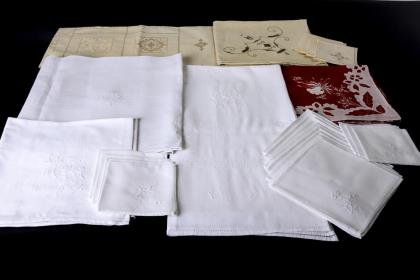 2 Ziertischdecken mit Blumenstickerei, dazu 7 passende Miniaturservietten. / Glattleinendecke mit Hohlsäumen und Locharbeiten. / Leinenbatistdecke mit Hohlsäumen und gestickten Blüten, dazu 4 passende Servietten. / Rote Leinenbatistdecke mit Applikationen und gestickten Blüten. / 8 Servietten mit Blütenstickerei und Hohlsaum. / Ziertischtuch mit Hohlsäumen, fein gestickten Blütenkränzen und Durchbrucharbeiten