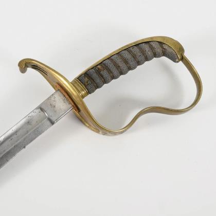 Leichter Säbel mit geschwungener, einschneidiger Klinge mit Spitze in der Mittellinie. Beidseitig auf der Klinge geätztes Monogramm "L" mit Krone. Messinggefäß, gerippter Griff mit Fischhautbezug, dieser etwas defekt. Schwarze Metallscheide mit einem Ring
