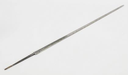 Schmale, konische Klinge mit tiefem, kurzem Hohlschliff. Dieser geht in einen Grat über, rhombischer Querschnitt der Klinge. Im Hohlschliff Beschriftung. Eisengriff mit floralen Reliefmustern. Zwei nierenförmige Stichblätter und zwei Fingerringe. Griff mit geflochtener Drahtwicklung