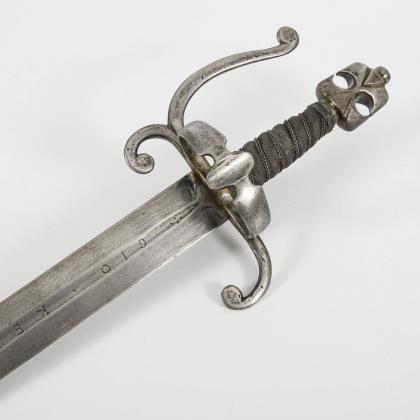 Gerade, zweischneidige Klinge, im Querschnitt sechskantig, zum Griff hin mit schmalem Hohlschliff. Beidseitig bekröntes Monogramm für Max Joseph. Herzförmiges Eisenstichblatt, Parierstange, Bügel und Eichelknauf. Drahtwicklung wohl jünger ergänzt