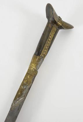 Gerade, zweischneidige Klinge. Messinggefäß mit unterschiedlichen Perlrändern