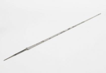 Schlanke, zweischneidige Klinge mit sechskantigem Querschnitt und kurzem Hohlschliff. Darin Inschrift: "VIVAT CAROLUS III", "Rex Hispania MDCXXX". Tief eingeschlagene Marke mit einem lorbeerbekränzten Männerkopf im Profil. Messinggefäß mit Drahtwicklung wohl etwas jünger