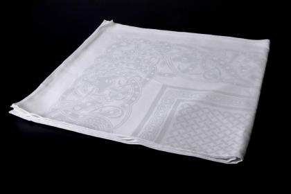 Tuch mittig mit Jagdschlossmotiven, umgeben von Hirschen. In den Ecken Jäger mit Hund. 2 große gestickte Monogramme GH