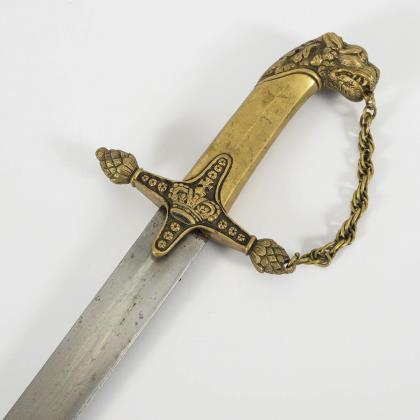 Schmale gekrümmte, einschneidige Klinge, mit Spitze in der Mittellinie. Klinge mit reichem Ätzmuster. Messinggriff, Löwenkopf mit roten Glasaugen, auf Bügel und Griffring Eichenlaubrelief, auf Stichblatt zwei gekreuzte Schwerter. Schwarze Metallscheide mit einem Ring