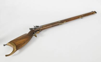 Perkussionsbüchse mit gezogenem Lauf, Dioptervisier, Hahnsicherung und Stecher sowie Ladestock aus Metall. Kolbenende mit geschwungener Schulterstütze aus Messing