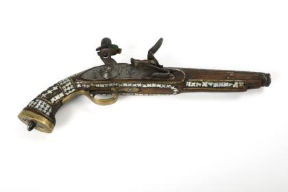 Steinschlosspistole mit Perlmutteinlagen.