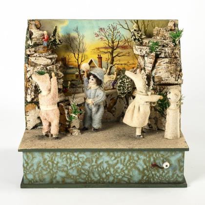 In der Art von Gottlieb Zinner. Kleine Szenerie mit sich bewegenden Figuren, 2 Felsen und lithografiertem Hintergrundbild. Intaktes Werk mit Handkurbel, spielt "O du Fröhliche"