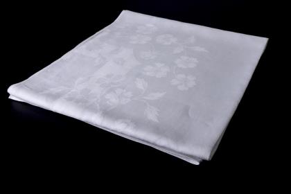 Umlaufend breiter Jaquardstreifen. Mittig Oval aus filigranen Blumen und Blüten