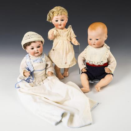 Alle jeweils mit Kurbelkopf, Schlafaugen und 5-teiligem Babykörper (teils mit kleinen Bestoßungen). Dreambaby (AM 351) mit dunkelblauer Strickhose. Kopf locker, L 30 cm. / Charakterbaby (AM 980) mit brauner Mohairperücke und weißer Babykleidung, L 28 cm. / Kleine blonde Puppe (Heubach 320) mit weißem Kleidchen. Chip am linken Auge, 2 Finger fehlend, L 29 cm