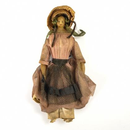 Stoffpuppe mit Brustkopf und Unterarmen aus Wachs. Originalbekleidet mit rosa Kleid und Strohhut