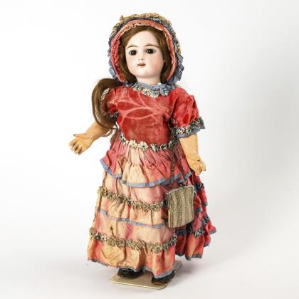 Kurbelkopf, braune Glasaugen, Ohrlöcher, braune Echthaarperücke mit Korkdeckel. Französischer Steifgelenk-Körper. Defektes lachsfarbenes Kleid mit Rüschen, passende Haube, alte schwarze Schuhe, Perltäschchen