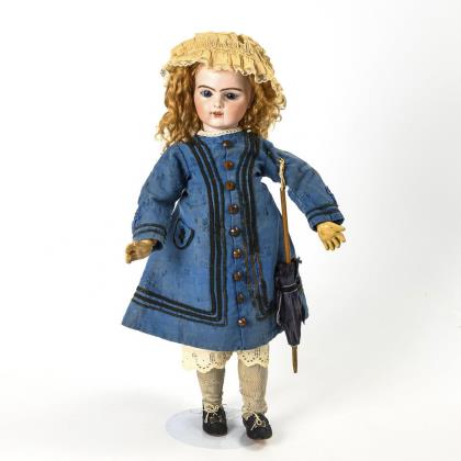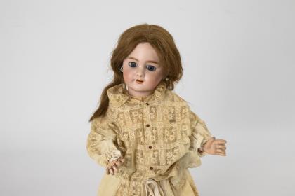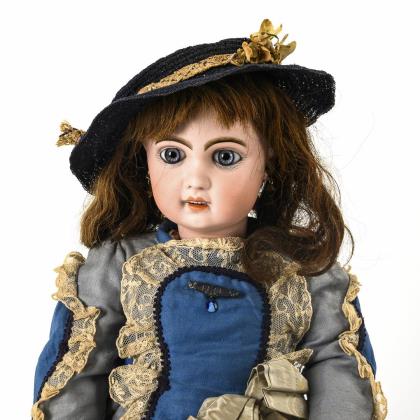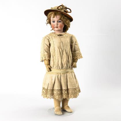 Kurbelkopf, blaue Schlafaugen, Ohrringe, dunkelblonde Echthaarperücke. 17-teiliger Gliederkörper. Cremefarbenes Kleid, passender Hut mit brauner Samtkrempe