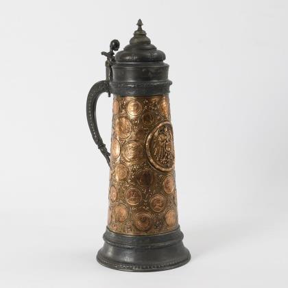 Gestufter Fuß teils ornamental reliefiert, Kupfer-Wandung allseits überaus zahlreich mit reliefierten Münz-Abbildungen versehen; in der Mitte im Lorbeerkranz der Reichsadler mit Hohenzollern-Wappen auf der Brust. Am Lippenrand gestichelte Widmung von 1891. Gestufter Scharnierdeckel mit dem Drücker in Form des Reichsapfels in einer Adlerklaue sowie reliefierter Henkel