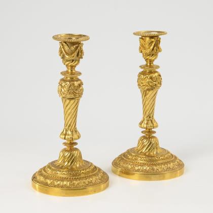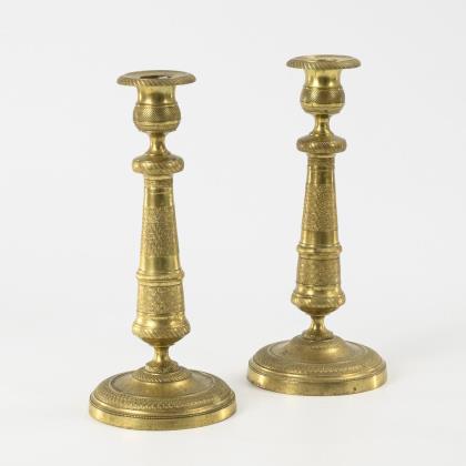 Sehr fein umlaufend ornamental verzierte Bronzeleuchter mit Rundfuß, Säulenschaft und Wachsteller