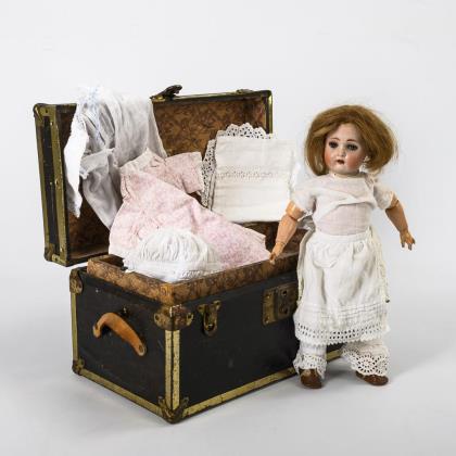 Kurbelkopf, blaue Schlafaugen, Wimpern, mittelblonde Echthaarperücke, 11-teiliger Gliederkörper, weiße Kleidung, braune Schuhe. Kopf durchleuchtet: ohne Defekte. L 40 cm. / Dazu 2 Nachthemden, Häubchen und Kissenbezug. / Dunkelbraune Reisetruhe mit Metallbeschlägen, innen mit Klebeetikett "Green Toy Works, Trade Mark, USA". Altersspuren, 1 Griff defekt. 21,5 x 41 x 22,5 cm