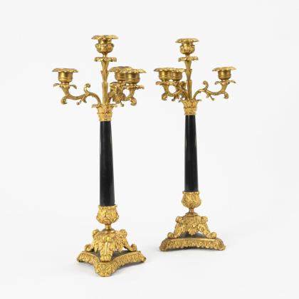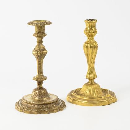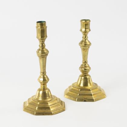 Sehr ähnliche Bronzeleuchter in barocken Formen mit gestuftem Oktogonalfuß und ebenso kantigem Balusterschaft mit Tülle