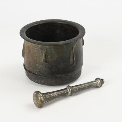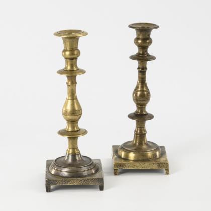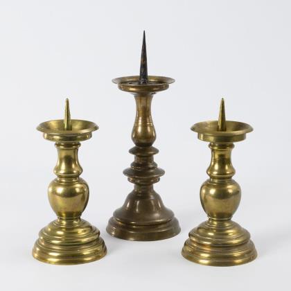 Paar massive Bronzeleuchter in gedrungener Balusterform mit Bronzedorn in der Tropfschale. / Schwerer Leuchter mit hohem Fuß, breit gewirteltem Balusterschaft und Tropfschale mit eingenietetem Eisenblech als Halterung für den Eisendorn