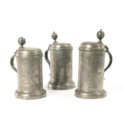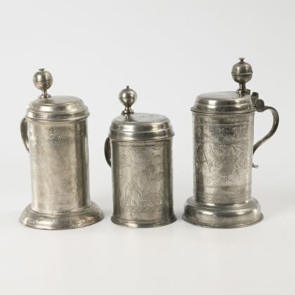 Ähnliche Krüge je mit gravierten Wandungen: 2x sächsisches Wappen mit Kurschwerten, 1x mit Liebespaar. Auf den Deckeln je gravierte Monogramme mit Daten 1798, 1800 bzw. 1808