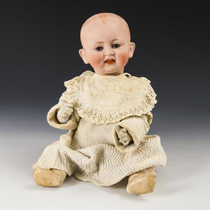 Vollkopf, blaue Schlafaugen, offen/geschlossener Mund mit modellierter Zunge. Stark beriebener, 5-teiliger Sitzbabykörper. Alte, helle Babykleidung