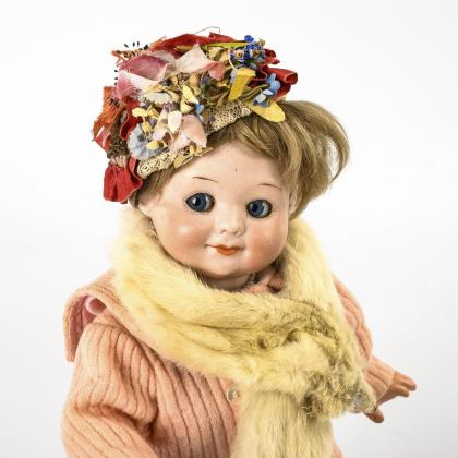 Kurbelkopf, zur Seite blickende, blaue Schlafaugen, geschlossener Mund, blonde Mohairperücke. 5-teiliger Stehpuppenkörper. Rosa Jacke, Hermelinschal, Hütchen mit Blumenschmuck, weinrote Hose, passende Häkelschuhe
