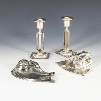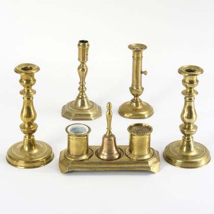 1 Paar Spätbiedermeier-Balusterleuchter, 1 Schiebeleuchter und 1 barocker Bronzeleuchter. Schreibzeug-Sockel mit 3 Aussparungen für Tintenfass mit glasiertem Keramikeinsatz, Streubüchse und hier mit Handglocke