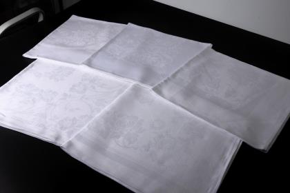 Verschiedene Tücher mit floralen Dekoren u.a. Chrysanthemenblüten, Astern, Rosenzweige und Wildrosen zwischen Bordüren, Schleifenband und Girlande. Gestickte Monogramme BSB/JO