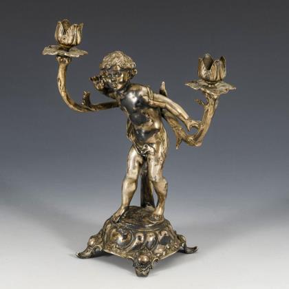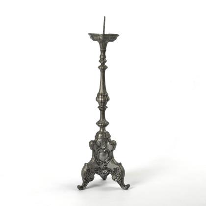 In Silberart gefertigter, großer Kerzenleuchter mit reicher Reliefzier und leeren Kartuschen auf allen Seiten des 3-seitigen Sockels. Schlanker Balusterschaft mit Riffelung sowie godronierte Tropfschale