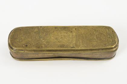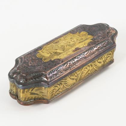 Oblonge Dose mit passig geschweiften Schmalseiten. Auf dem Boden und Scharnierdeckel fein gravierte Paar-Szenen mit Sinnsprüchen in ornamentalen Gravurrahmen mit Begleitpersonen. Auf der Wandung umlaufendes Gravurornament