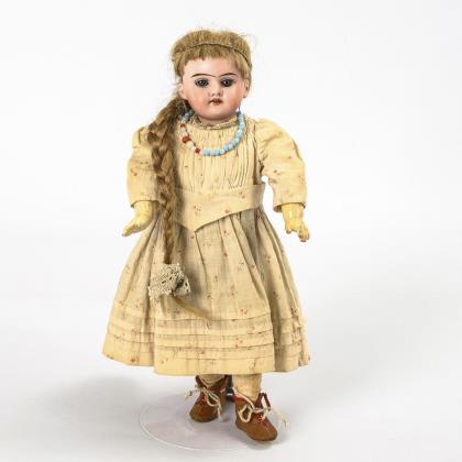 Kurbelkopf, feste blaue Augen, blonde Echthaarperücke mit langem Zopf. 9-teiliger Gliederkörper. Helles altes Kleid, ergänzte Lederschuhe