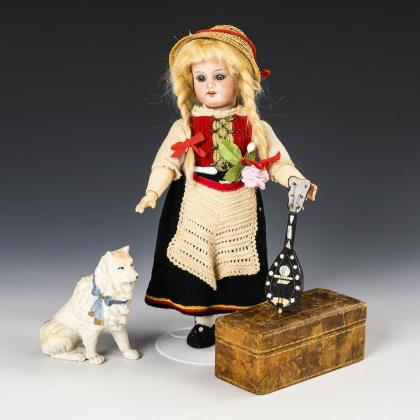 Kurbelkopf, blaue Schlafaugen, blonde Mohairperücke mit Zöpfen. 13-teiliger Gliederkörper. Gestricktes Kleid im Trachtenstil, Strohhut, L 27 cm. Dazu Miniatur-Laute in braunem Kasten (5 x 13 x 6 cm) und weißer Hund mit modellierter Halsschleife aus Biskuitporzellan (H 10,5 cm)