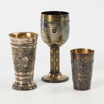 Überaus reich reliefierte Gefäße in den Formen des Barocks bzw. der Renaissance. Der Deckelpokal mit Schriftzügen in den Kartuschen zu Schlachten im Deutsch-Französischen Krieg; an der Lippe Gravur: "Dem tapferen Krieger A. Berchtold zur Erinnerung an 1870/71 gewidmet v./s. Schwester B. Seitz-Berchtold"
