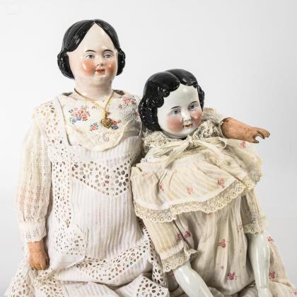 Beide mit Brustkopf, blauen Schlafaugen, originaler Perücke, Lederkörper und kariertem Kleid aus alten Stoffen. Dressel & Koch-Puppe mit Unterarmen und -schenkeln aus Masse, sowie weißer Spitzenhaube. Brandriss an linkem Ohr und Augenrand, rechtes Auge geklebt, Schlafaugen verklemmt. Kleine Bestoßungen am Körper. L 62 cm. Heubach-Mädchen mit ungleichen Porzellanunterarmen und grünem Gazehütchen. Haarriss am Hinterkopf, kleiner Chip am Auge, 1 Finger bestoßen. L 58 cm