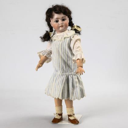Porzellankopfpuppe mit gestreiftem Kleid. Adolf Wislizenus.