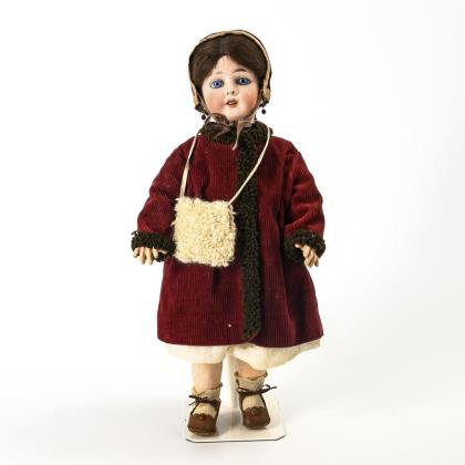Kurbelkopf, blaue Paperweight-Augen, Ohrringe, dunkelbraune Echthaarperücke, Korkdeckel. 11-teiliger Gliederkörper. Weinroter Cordmantel, schwarze Samthaube, braune Lederschuhe