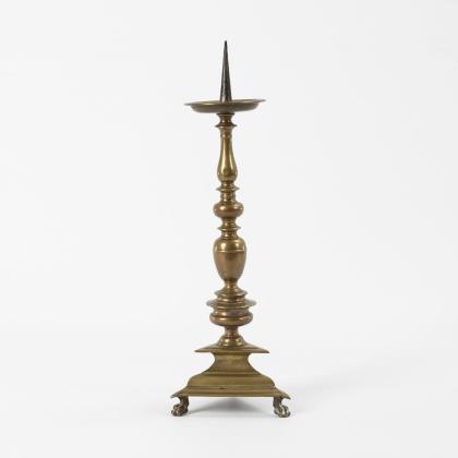 Bronzeleuchter mit dreieckigem, gestuftem Sockel auf Tatzenfüßen, 2-teiligem Schaft aus mehreren Balustern mit Wirteln sowie Tropfschale mit Eisendorn