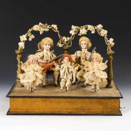 In der Art von Gottlieb Zinner. Holzkasten mit 2 musizierenden und 3 tanzenden Püppchen mit Porzellanköpfen. Intaktes Werk mit Handkurbel