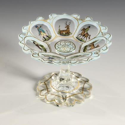 Facettierte Schale mit mehrpassigem Rand, facettierter Schaft, mehrpassiger Fuß, Bodenstern. Auf der Schale polychrom emailgemalte Darstellungen von Jägern, Wild und Hunden