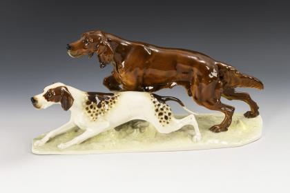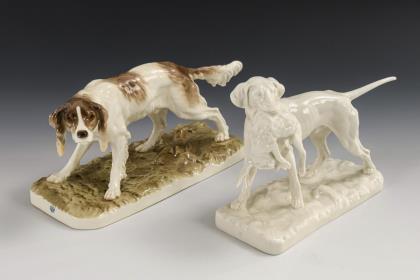 1x Modell-Nr. 429, Entwurf 1905 von Pierre Jules Mêne (1810-1879): Setter auf einem Natursockel (H 12 cm). / 1x Modell-Nr. 150, Entwurf 1905 von Pierre Jules Mêne: Jagdhund mit Hase (H 14,5 cm)