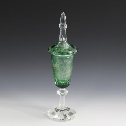 Konische Kuppa mit Olivenschliff, Deckel mit hohem, facettiertem Knauf, facettierter, nodierter Schaft, mehrpassiger Fuß. Umlaufend graviert mit der Darstellung einer Waldlandschaft mit Jäger, Jagdreitern, Hunden und Wild, unterseitig ein graviertes Wappen mit Löwen und Doppeladlern
