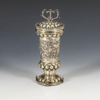 Reliefierter Deckelpokal mit Jagdszene und Buckelzier. Deckel mit kleinen Randzinnen und Geweih-Knauf